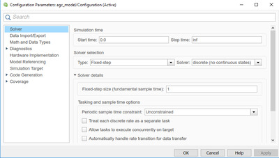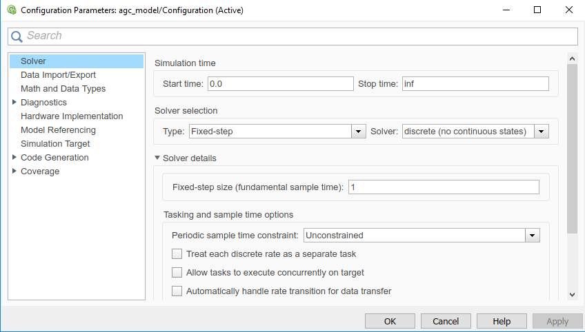 После создания новой Simulink модели необходимо настроить параметры симулятора. По умолчанию Simulink при численном решении системы дифференциальных уравнений, полученной из модели, динамически подстраивает шаг дискретизации. Для моделирования HDL-блоков это не подходит, так как период тактового сигнала постоянный. Максимальный шаг дискретизации удобно установить равным единице, так как тогда одной секунде модельного времени будет соответствовать один такт работы блока. Окно настроек симулятора представлено на рисунке 3.