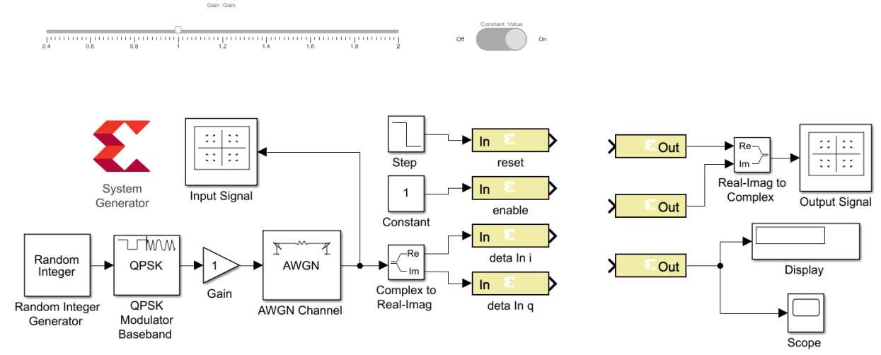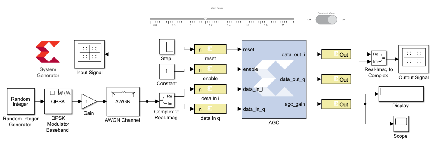 В данной статье рассматривается возможность применения Vivado System Generator для моделирования HDL-блоков на примере системы автоматической регулировки усиления. Представлен принцип работы автоматической регулировки усиления и её реализация на Verilog. Описано поэтапное построение Simulink модели. В качестве входного воздействия рассматривается смесь QPSK сигнала и белого шума.