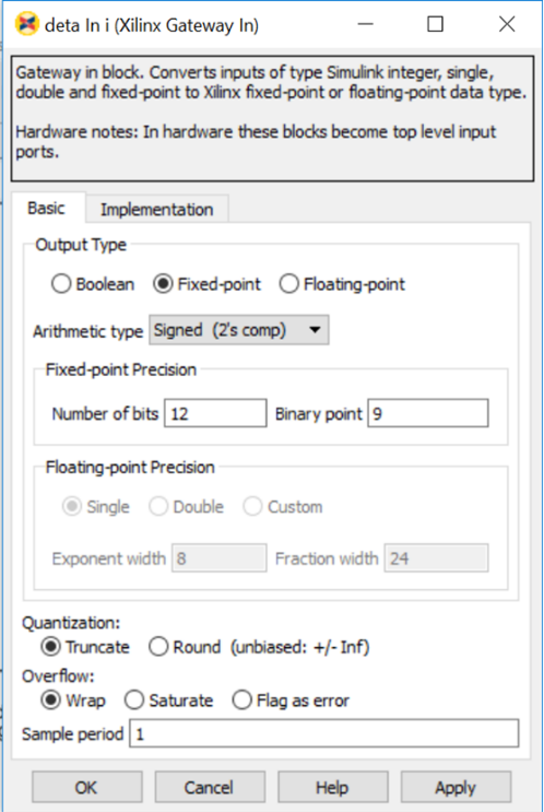 На этом этапе в модель внесены все Simulink блоки. Для передачи данных между блоками Simulink и блоками System Generator необходимо добавить блоки Gateway In и Gateway Out. Настройки блоков Gateway In, управляющих портами АРУ reset и enable, представлены на рисунке 7-а). Настройки блоков для управления портами data_in_i и data_in_q показаны на рисунке 7-б). Основные параметры – это формат входного сигнала, квантование, обработка переполнения и шаг дискретизации.