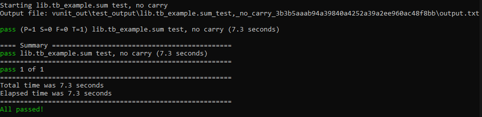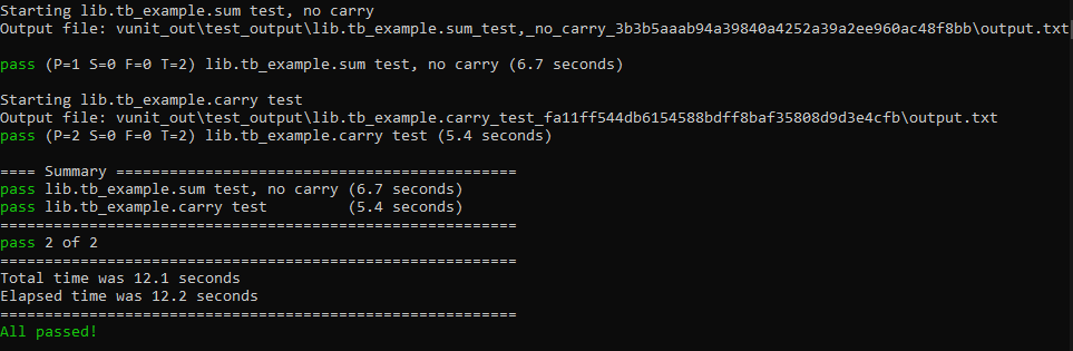 Теперь мы видим, что VUnit запускает оба тестовых случая: «суммарный тест, без переноса» и «тест с переносом». Оба тестовых примера проходят через наши самопроверяющиеся утверждения BFM без сбоев. Теперь мы можем сообщить, что наш проект поддерживает все необходимые функции.