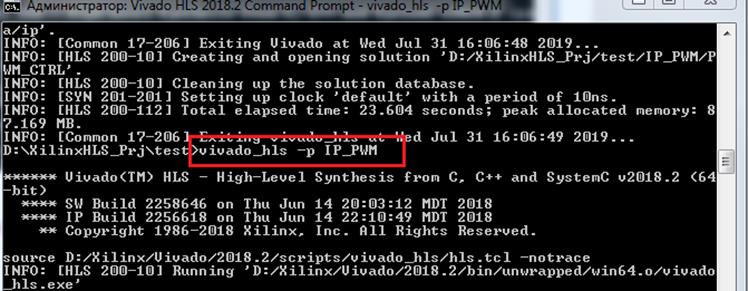 3. Пишем в консоль vivado_hls -f ip_pwm.tcl (Рисунок 7).