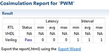 После того, как ко-симуляция закончится, автоматически откроется отчет. Не пугаемся того, что у нас в нём везде нули. Раздел «Latency» показывает, какое количество периодов тактовой частоты необходимо функции для вычисления всех выходных значений – но у нас ничего не вычисляется, а просто значение регистра, задаваемого через AXI, присваивается выходному сигналу. Раздел «Interval» показывает, какое количество периодов тактовой частоты необходимо функции, чтобы она могла принять новые данные на вход.