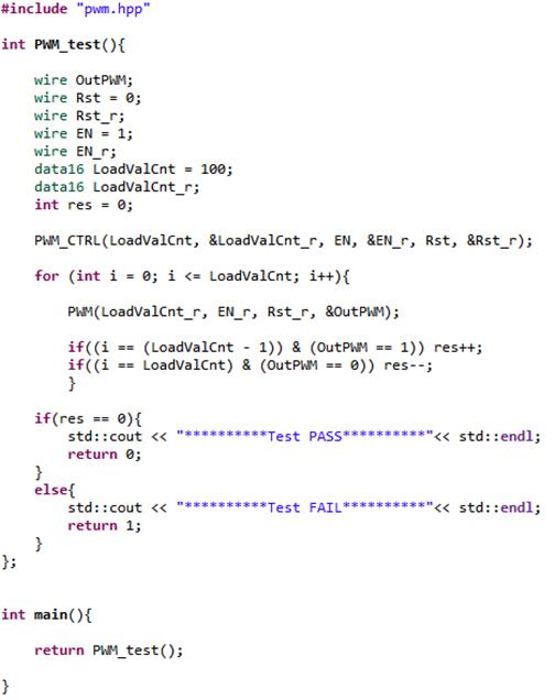 Нам необходимо проверить, что при достижении счетчиком значения, равного заданному (LoadValCnt), выход изменит значение с «1» на «0». Для этого зададим значения с помощью PWM_CTRL и вызовем наш счетчик (LoadValCnt + 1) раз. Переменная res увеличивается на 1, если выход ШИМ равен «1», и значение счетчика на следующей итерации должно стать равным значению LoadValCnt. При достижении значения LoadValCnt выход должен быть равен «0», а переменная res уменьшится на 1. Если что-то будет не так, то res не будет равна нулю. После написания это выглядит так: Рисунок 14.