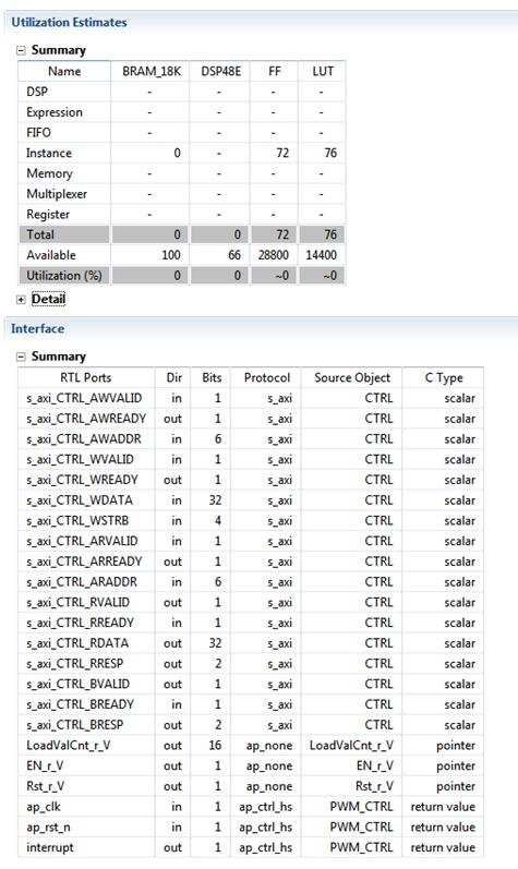 После того, как синтез закончится, автоматически откроется отчет, в котором можно посмотреть получившуюся долю использования ресурсов кристалла (утилизацию) и то, какие интерфейсы будут у нашего IP-блока (Рисунок 27). Как видим, добавились порты тактирования, сброса и прерываний.