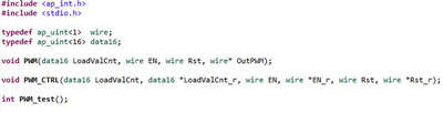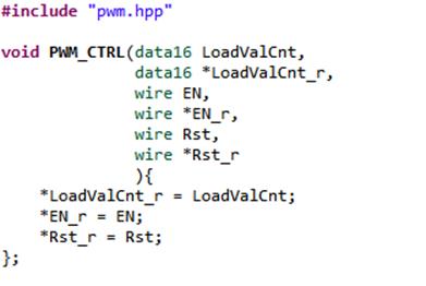 Начнем с функции PWM_CTRL (Рисунок 12). Эта функция должна просто хранить и выдавать значения, которые будут управлять счетчиком. Она не должна ничего возвращать, поэтому её тип возврата – void. Т. к. счетчик будет шестнадцатиразрядный, то загружаемое значение должно быть той же разрядности. Сигналы включения и программного сброса – однобитные.