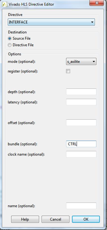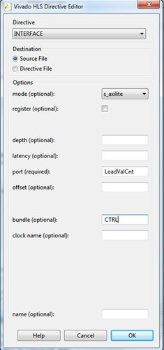 Для того, чтобы наши переменные были доступны через AXI, необходимо указать это (Рисунок 22). Важным моментом является опция названия объединения (bundle) т. к. иначе для каждой переменной будет создан свой отдельный порт.
