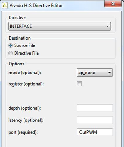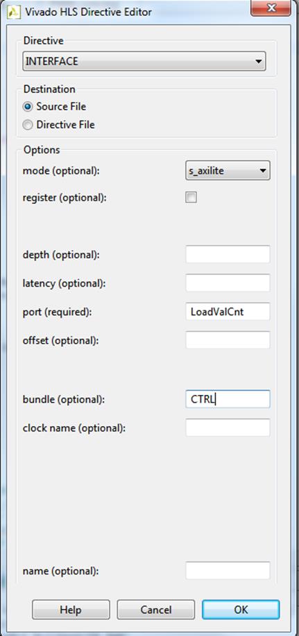 Дважды щёлкнем по «PWM», откроется редактор директив, выберем в нём директиву и опции, как показано на рисунке ниже (Рисунок 18). Выбранная опция указывает компилятору, что на уровне функции нам не нужны сигналы управления (т. к. управлять мы будем сами). Директивы могут находиться непосредственно в описании функции, а могут находиться в файле с директивами, в нашем случае будем использовать первый вариант. Теперь сделаем тоже самое для OutPWM (Рисунок 19). Если нажать кнопку «Help», то можно подробно ознакомиться с каждой опцией, которая относится к этой директиве. Также там можно прочитать, какие опции используются по умолчанию. На этом подготовка функции PWM к синтезу окончена.