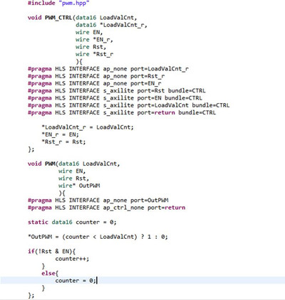 Эта статья – небольшое руководство для тех, кто хочет сделать собственный IP-блок для FPGA (фирмы Xilinx) с помощью HLS (High Level Synthesis [1], синтез с языков высокого уровня). Ниже по порядку будут описаны основные шаги такой разработки. В качестве примера будет разработан простейший ШИМ с управлением по шине AXI4-Lite, который будет изменять яркость светодиода на отладочной плате MiniZed [2].