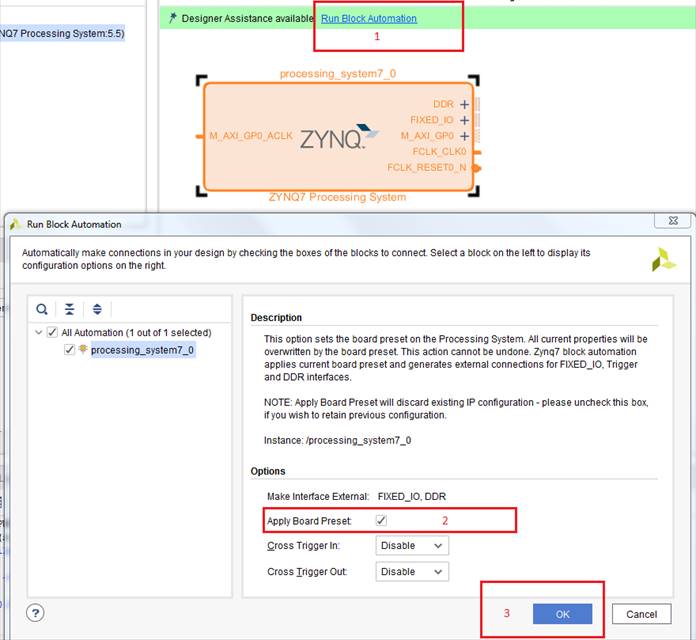 Нажимаем на плюс на рабочей панели в открывшемся окне и выбираем “ZYNQ7 Processing System”. После того как IP добавится в блок дизайн появится помощник. Нажимаем на “Run Block Automation”. Проверяем, чтобы стояла галочка напротив пункта с применением параметров предустановки (Рисунок 3) – это необходимо для того, чтобы все интерфейсы, которые есть на плате и используются цинком, были настроены корректно.