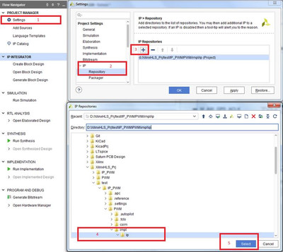 Теперь добавим наши IP-блоки. Для этого в менеджере проекта заходим в настройки, переходим во вкладку IP, выбираем вкладку Repository, нажимаем на плюс, указываем путь к IP блоку. IP-блоки можно найти в папке impl → ip каждого отдельного решения в Vivado HLS (Рисунок 5).