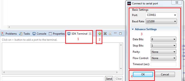 Подключаем отладочную плату к компьютеру. Нажимаем Ctrl + B (Build Project). Идем во вкладку “SDK Terminal” и нажимаем на кнопку добавления порта. В открывшемся окне нужно указать COM порт, к которому подключен USB UART преобразователь и скорость обмена данными (Рисунок 5). Узнать номер порта можно в диспетчере устройств во вкладке COM и LPT.