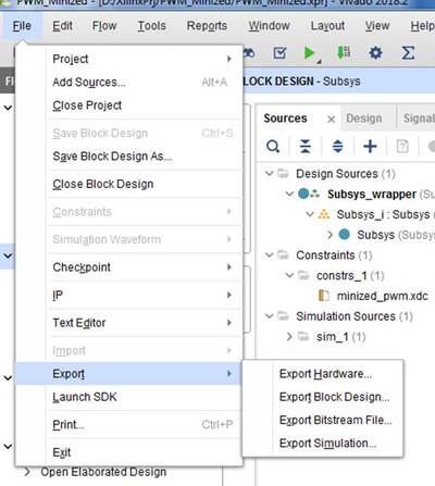 Начнем с экспорта в SDK. Для этого в Vivado идем в меню File→Export→Export Hardware (Рисунок 1). Отмечаем галочку “Include bitstream”. Затем снова идем в меню File→Launch SDK.