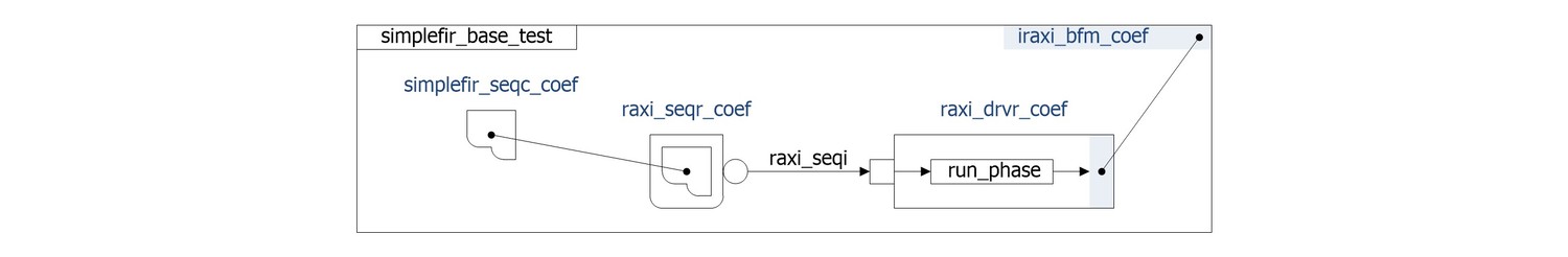 Генератор запускается на секвенсере raxi_seqr_coef, который передает формируемые транзакции типа raxi_seqi в драйвер raxi_drvr_coef. Драйвер, в свою очередь, транслирует их на интерфейс загрузки коэффициентов iraxi_bfm_coef.