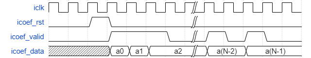 Процесс загрузки коэффициентов начинается с подачи логической ’1’ на вход icoef_rst минимум на один такт. Это приведет к сбросу внутреннего массива коэффициентов, после чего на данный вход необходимо подать логический ’0’.