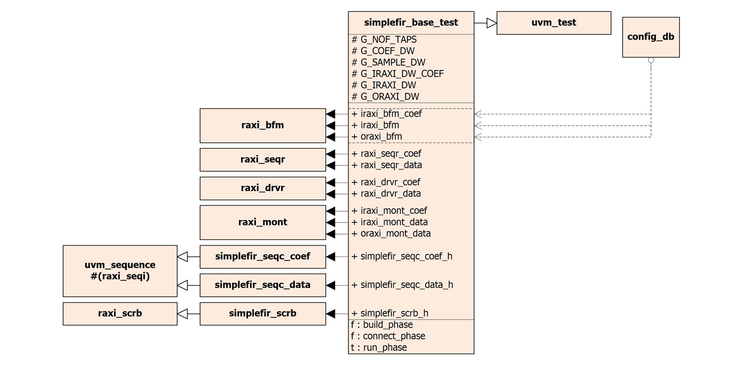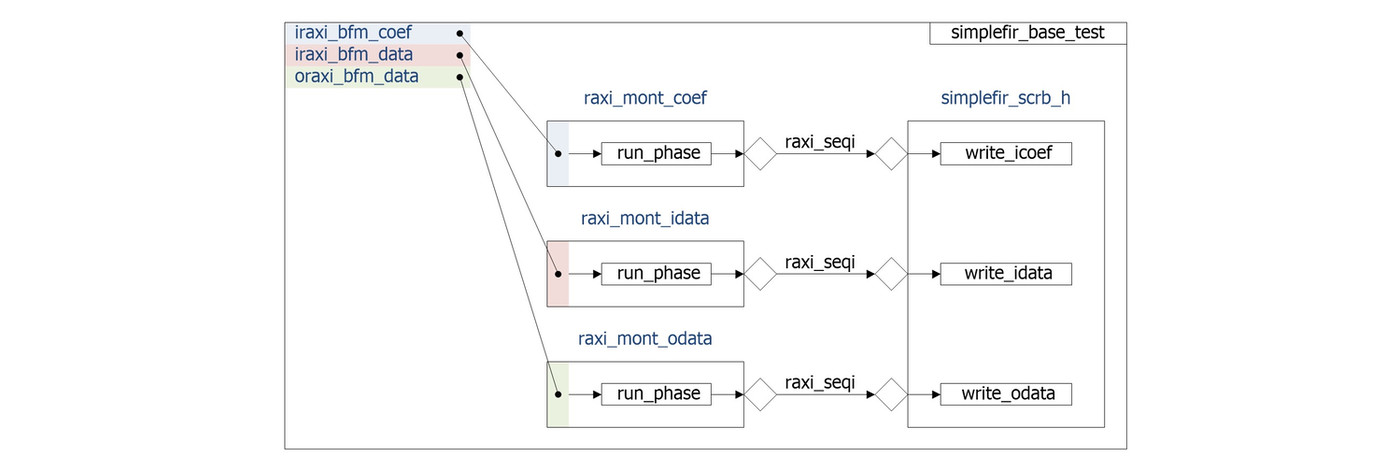 В тесте используются компоненты, предназначенные для работы с интерфейсом raxi_bfm и транзакциями типа raxi_seqi: секвенсеры типа raxi_seqi, драйверы типа raxi_drvr и мониторы типа raxi_mont. С их помощью обеспечивается передача данных между тестируемым КИХ фильтром и тестовым окружением через интерфейсы, которые извлекаются из uvm_config_db.