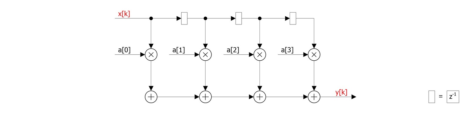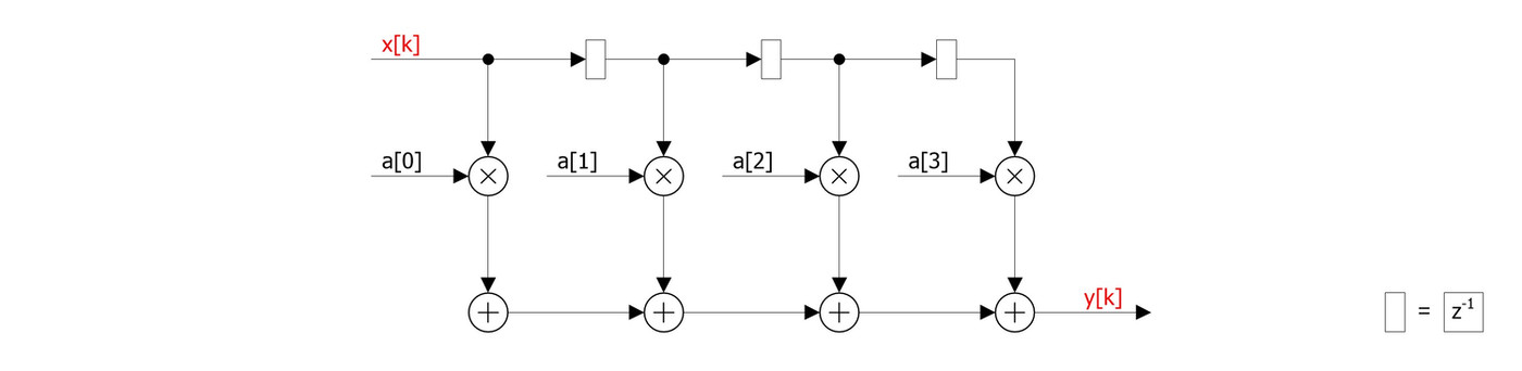 Как видно из данной схемы, для реализации КИХ фильтра используются три элемента: умножитель, сумматор и блок задержки.