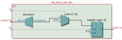 Один байт управляющего слова поступает на вход дешифратора, где происходит распознавание линии светодиодов в соответствии с таблицей 2.1, затем номер линии через мультиплексор подается на выходной регистр и через него на выходные порты, к которым и будут подключены светодиоды. Сигнал RST выключает все светодиоды, подавая через мультиплексор сигнал 8’h00 на выходной регистр, переводя в низкое состояние выходные линии.
