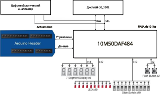 Так как передо мной стояла задача не только создать устройство i2c, но и отладить его работу, я решил, для отладки использовать плату Arduino Due. Просто она была у меня в наличии. Arduino Due я подключил к портам de10_lite ARDUINO_IO. Также для отладки я использовал элементы платы de10_lite, а именно имеющиеся на ней светодиоды, кнопки, переключатели и 7-ми сегментные индикаторы.