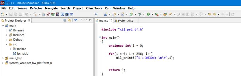 В SDK есть простой проект, который только выводит переменную цикла в консоль (рис. 4). Наша задача – сохранить содержимое консоли в файл, используя при отладке System Debugger.