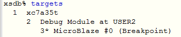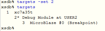 Как видим нам доступны три таргета. Символ «*» говорит, что текущий таргет MicroBlaze #0 и все наши команды из консоли будут адресованы текущему таргету, т.е. MicroBlaze’у. Для нас таргетом должен быть MDM. Чтобы это сделать необходимо выполнить команду targets c опцией –set (рис.8). После ввода команды установки таргета, проверяем, прошла ли установка, написав команду targets
