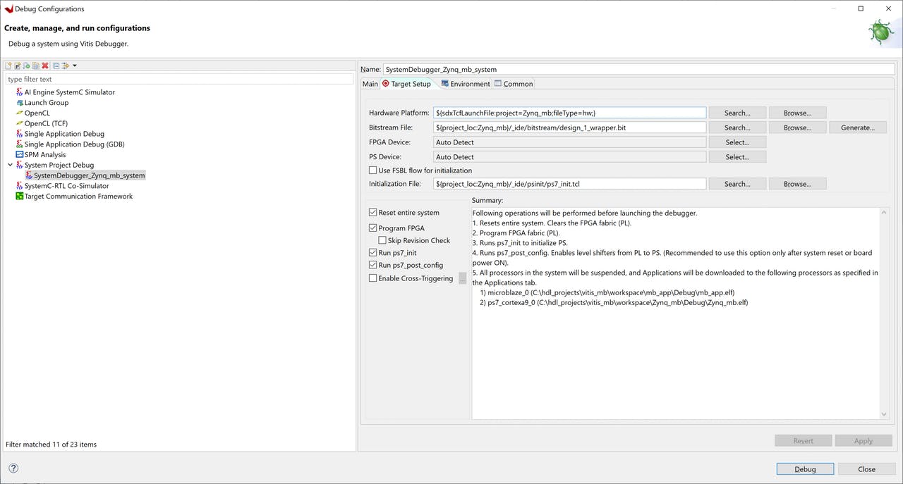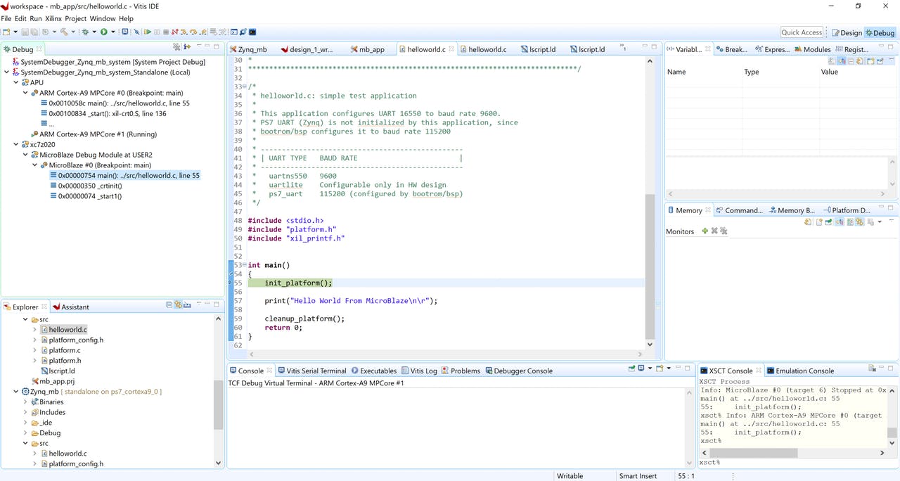 После того как MicroZed настроен, мы можем выполнить код по шагам или запустить процессоры в соответствии с требованиями приложения.