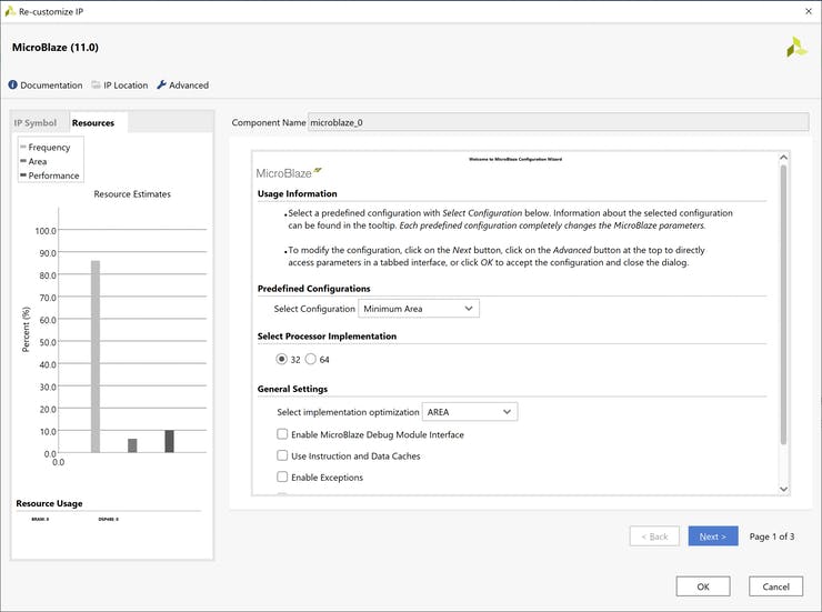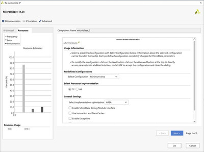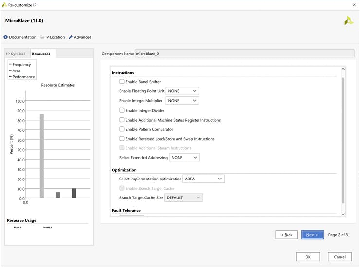 Следующим шагом является добавление блока MicroBlaze Processing и настройка его на минимальную площадь.