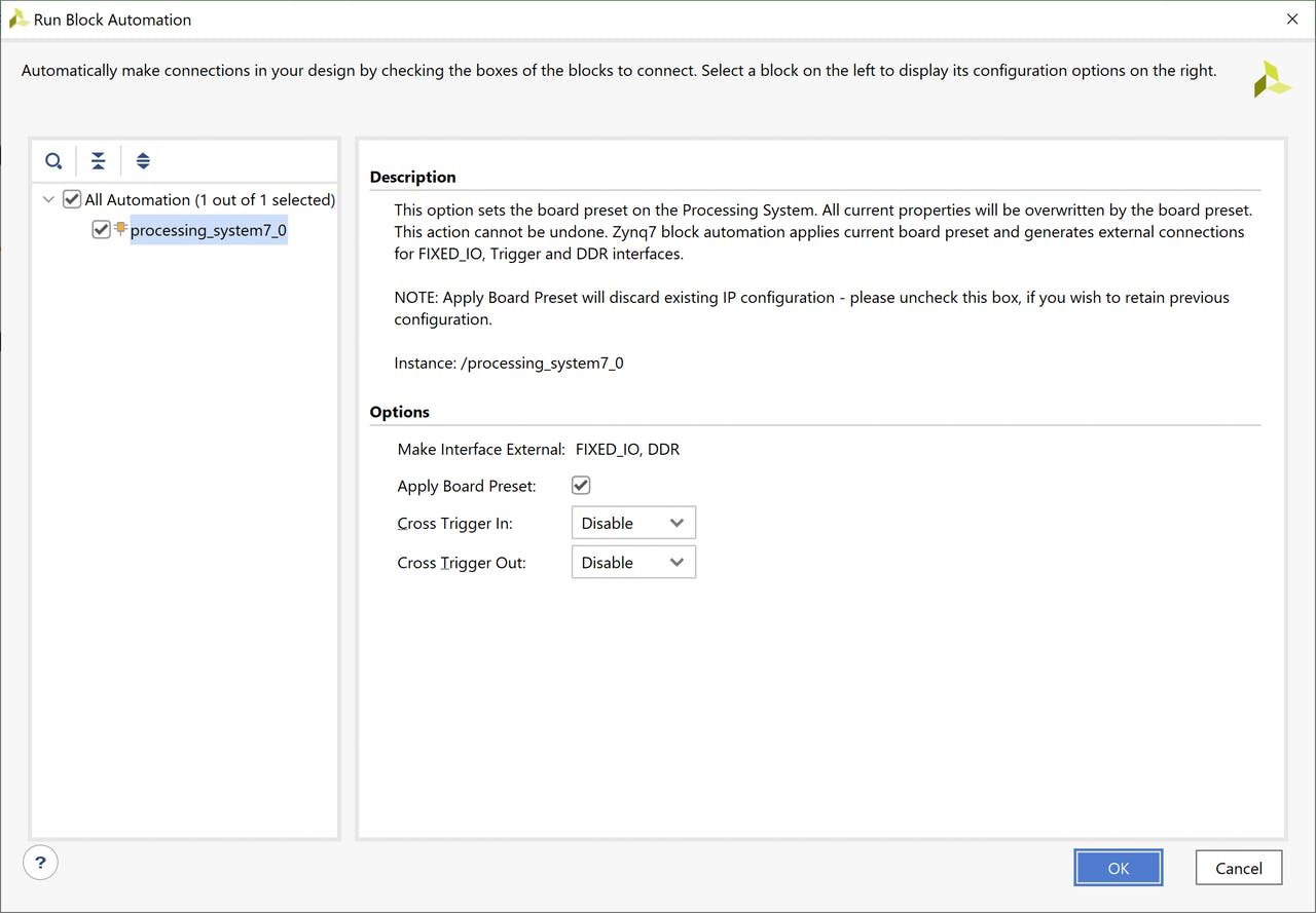 После добавления системы обработки запустите автоматизацию блоков, чтобы сконфигурировать Zynq PS в PL для реализации MicroZed 7020.