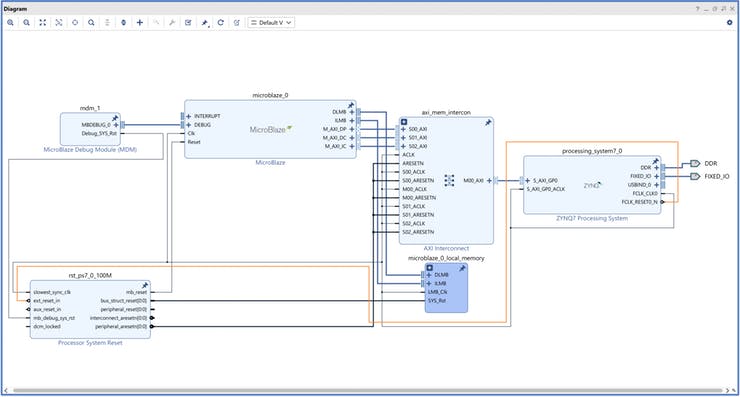 Когда мы подключаем порт MicroBlaze Peripheral AXI к порту ведомого (slave) GP на Zynq PS, MicroBlaze получает доступ к нескольким периферийным устройствам и памяти, которые доступны для Zynq PS. Завершающими этапами являются создание обёртки HDL, генерация битстрима и экспорт XSA.