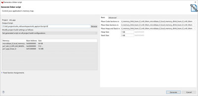 Мы хотим запустить код MicroBlaze из его внутренней BRAM. Выберите файл компоновщика (lscript.ld), доступный в исходном каталоге, и удалите его. В меню Xilinx выберите параметр «Создать сценарий компоновщика». Откроется диалоговое окно, в котором будет создан новый скрипт компоновщика. Убедитесь, что Code, Data, Heap и Stack находятся в локальной памяти BRAM.