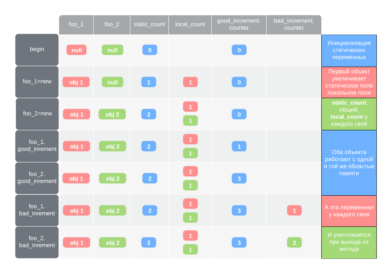 Во-первых, хорошо видно, что статическая переменная класса static_count является общей для всех экземпляров. Во-вторых, обратиться к ней мы можем как через экземпляр, так и через имя класса. В-третьих, повторные вызовы не-статического метода good_increment увеличивают значение одной и той же переменной, как и ожидалось.