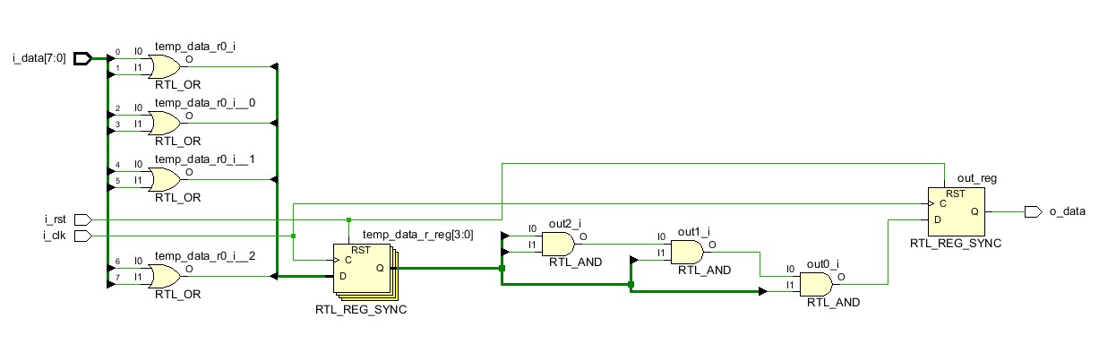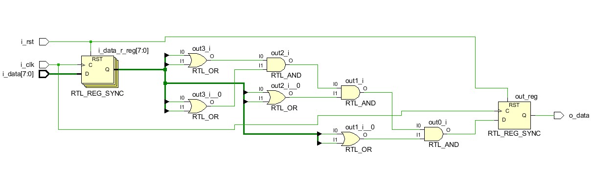 Обратите внимание, так-как триггеры со входа переместились в середину схемы, их количество изменилось: было 8 входных, а стало 4 промежуточных. В зависимости от архитектуры модуля и того, какие триггеры перемещаются, их количество может как уменьшиться, так и увеличиться, иногда на порядки. Поэтому следите за этим, так-как рост количества используемых триггеров приводит к увеличению ресурсоёмкости проекта и более разреженной по площади кристалла схеме, если речь идёт о FPGA и готовой архитектуре.
