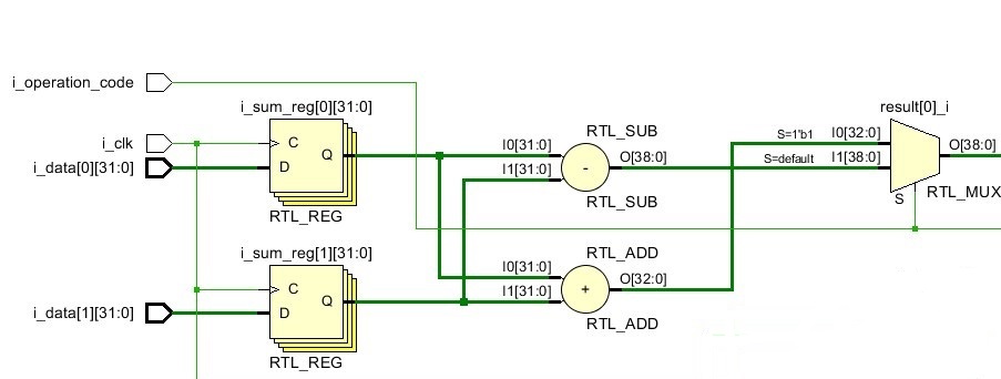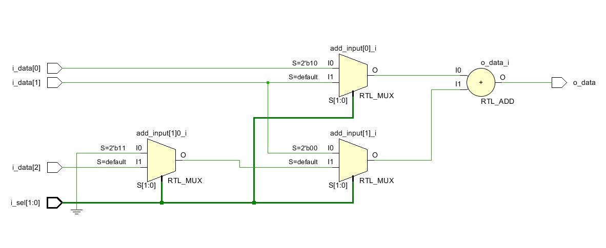 На схеме модуля adder_2, которая приведена на рис.4, удалось оставить всего один сумматор, однако за это нам пришлось заплатить размещением дополнительных мультиплексоров на входах оставшегося сумматора. Это породило дополнительный уровень логики между входом и выходом схемы: сигнал i_data[2] должен пройти два управляющих мультиплексора и выходной сумматор. В предыдущем случае i_data[2] как и все остальные сигналы данных проходит только через один сумматор и один мультиплексор. Разумеется, код можно ещё раз переписать, заменив цепочку мультиплексоров одним трёх входовым мультиплексором. Цель примера показать, что при неаккуратном описании переиспользования логики можно породить дополнительные логические уровни и как следствие ограничить диапазон рабочих частот.