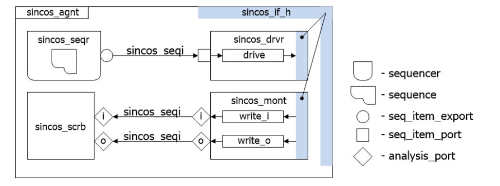 Здесь объявлен класс, наследующий класс uvm _ agent. Класс содержит интерфейс sincos _ if _ h, секвенсер, драйвер, монитор и scoreboard.
