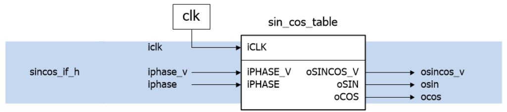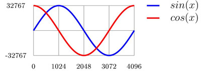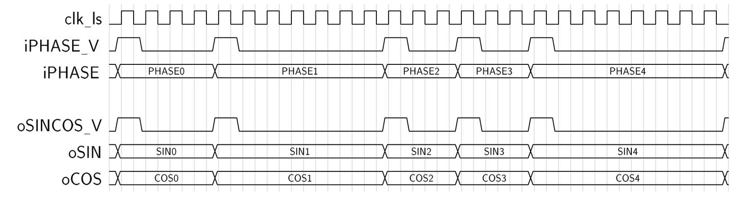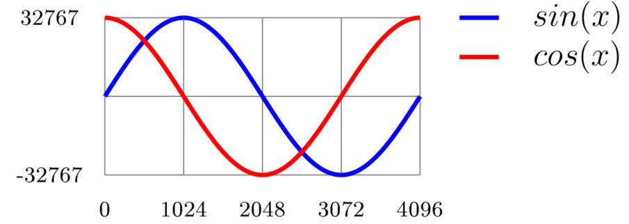 Выходы синуса oSIN и косинуса oCOS представляют собой 16-битные знаковые числа в диапазоне [−32768...32767] и сопровождаются значимостью oSINCOS _ V.