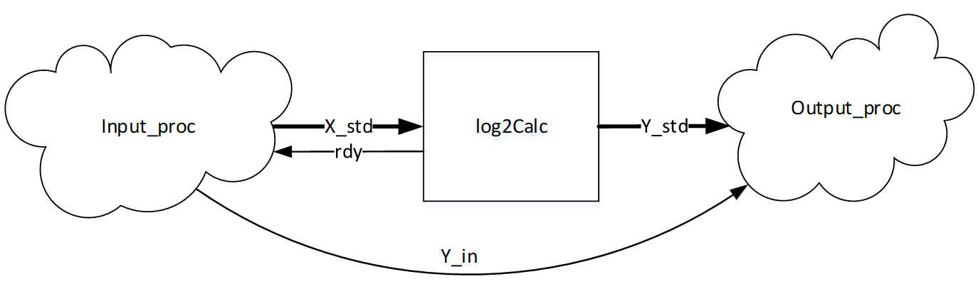 Параметры DW_IN, DW_IN_FRAC и DW_OUT_FRAC задаются пользователем, а разрядность выходного вектора DW_OUT задается функцией calc_dw из log2Calc_pkg на основе указанные выше трех параметров. RTL-блок не работает в конвейерном режиме, т.е. для вычисления одного значения требуется некоторое количество тактов, которое определяется функцией calc_latency из log2Calc_pkg.