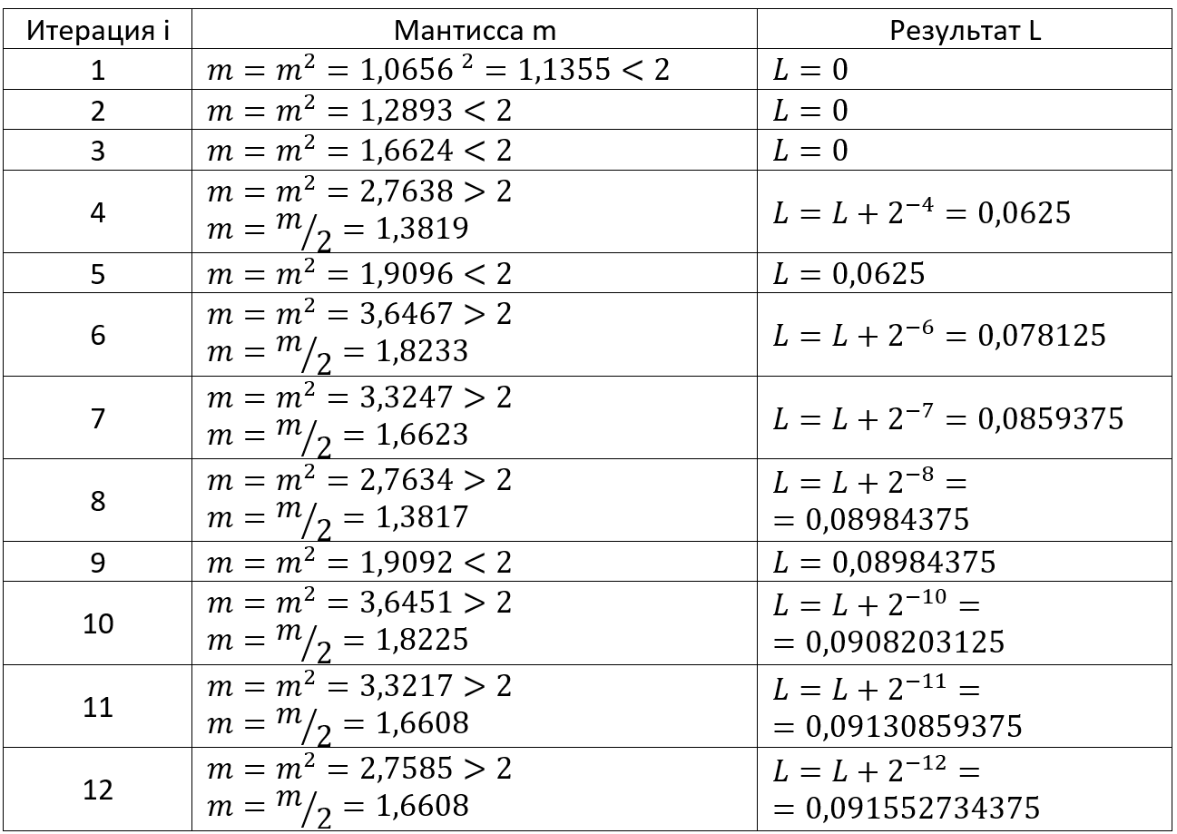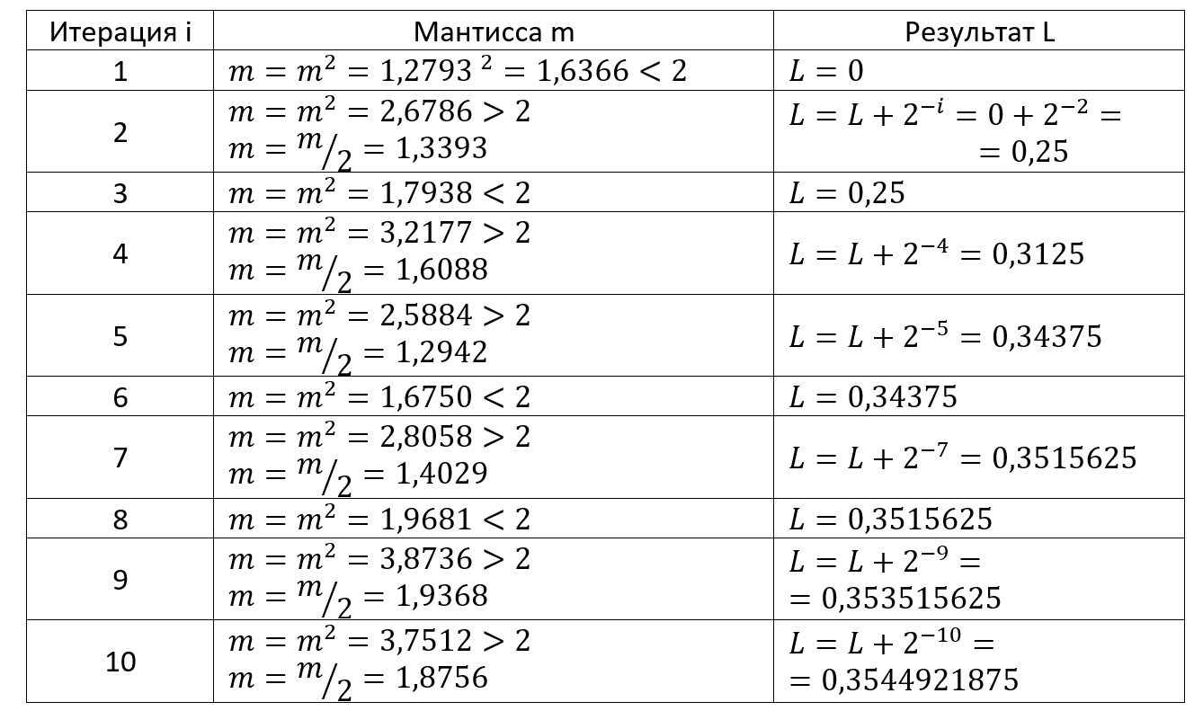 - Если мантисса m больше или равна 2, то m делится на 2 и к результату L суммируется 2-i, где i – номер итерации; иначе - ничего.