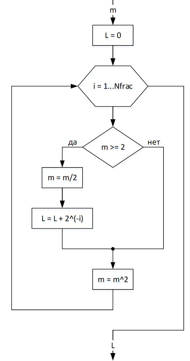 Получив мантиссу m можно вычислить log2(m) посредством логарифмического преобразования в соответствии с блок-схемой на рисунке 3. Процесс логарифмического преобразования выполняется следующим образом: