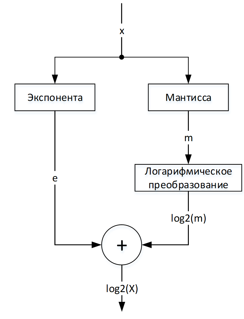 Тогда алгоритм вычисления можно представить блок-схемой на рисунке 1. Сначала параллельно вычисляется экспонента e и мантисса m, затем из мантиссы m логарифмическим преобразованием находится L = log2(m), и в конце результаты суммируются.