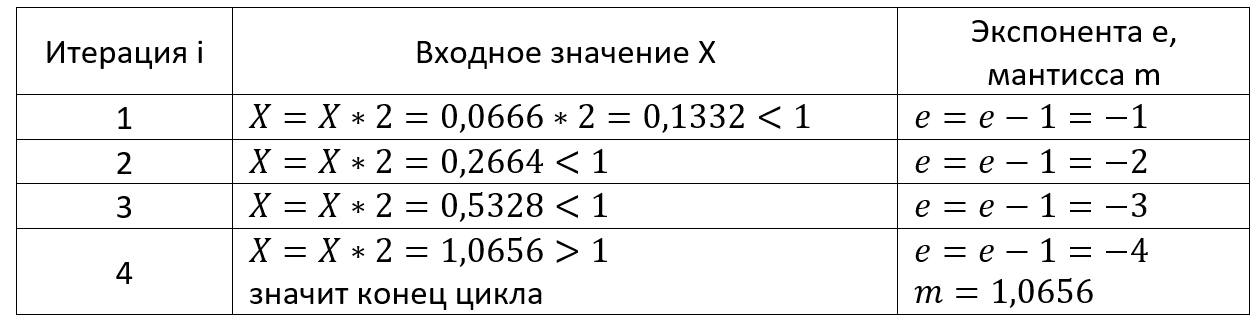 Вычисление экспоненты e и мантиссы m можно представить блок-схемой на рисунке 2. Процесс вычисления e и m выполняется следующим образом:
