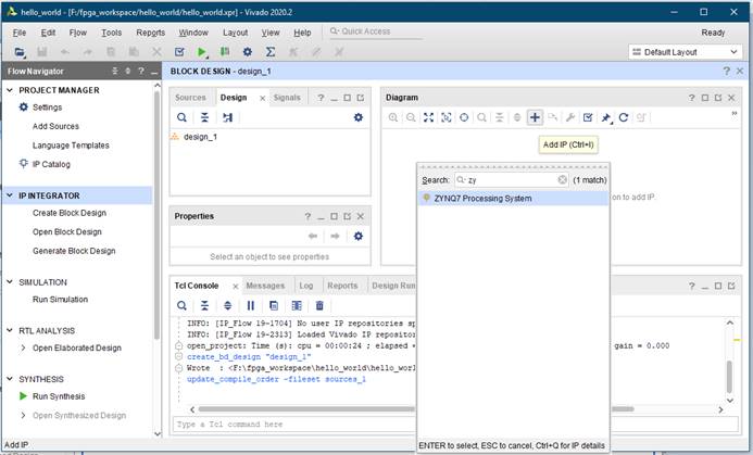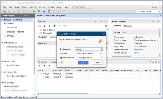 В IP INTEGRATOR создаем блок Create Block Design имя оставлю по умолчанию