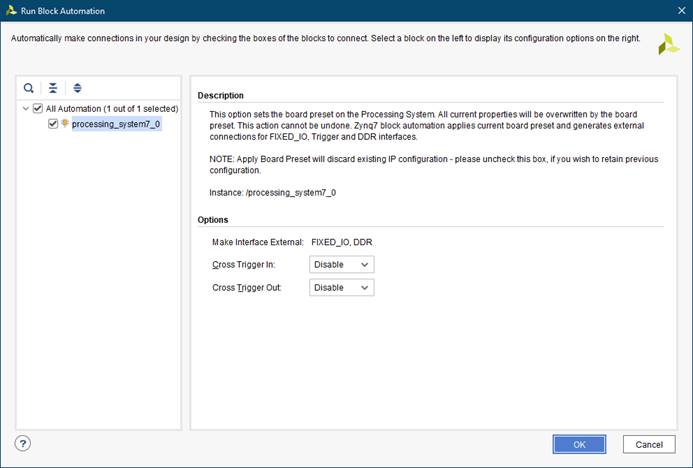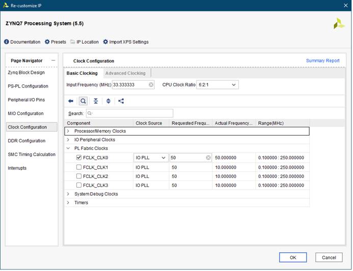 Если в будущих проектах планируется тактировать PL логику от системы ZYNQ в качестве источника, то это можно настроить во вкладке Clock Cinfiguration выход FCLK_CLK0