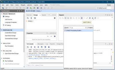 Создаем новый проект и попробуем повторить функционал, который выведет строчку "Hello world" чере UART порт (для того, чтобы это увидеть, нам потребуется переходник USB UART). В таком проекте потребуется настроить по-минимуму аппаратную часть ZYNQ: порт UART, DDR память; и написать прошивку для ядра.