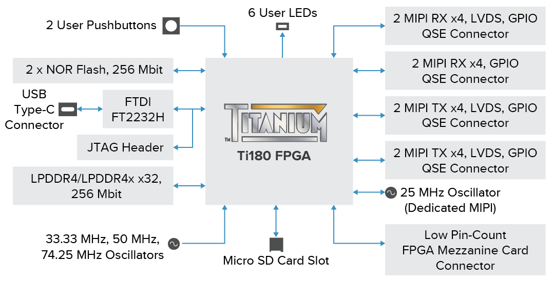 - Efinix Ti180M484I3 FPGA in a 484-ball FineLine BGA package