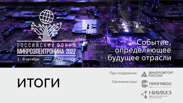 Российский форум «Микроэлектроника 2022», прошедший с 2 по 8 октября 2022 года на горном курорте Роза Хутор (Сочи), стал самым масштабным событием в отрасли микро- и радиоэлектронной промышленности России. 8-й по счету форум состоялся в традиционном очном формате с использованием новейших цифровых технологий. В нем приняли участие 1710 делегатов из 665 госкорпораций, ведущих производственных предприятий, дизайн-центров, научных учреждений, вузов, коммерческих структур, СМИ и бизнес-сообществ. Организаторы Форума – АО «НИИМЭ» и АО «НИИМА «Прогресс» при поддержке Министерства промышленности и торговли Российской Федерации, Министерства науки и высшего образования Российской Федерации.