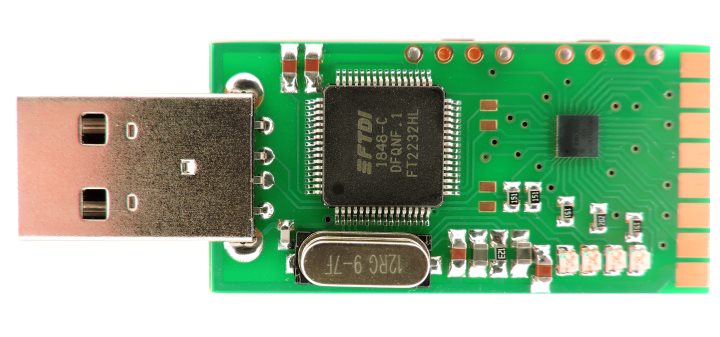 ПервоисточникПлата представляет собой USB dongle - просто вставляется в USB порт компьютера и можно начинать работать с ней - не нужно ни дополнительных программаторов (программатор MBFTDI уже на плате), ни проводов.