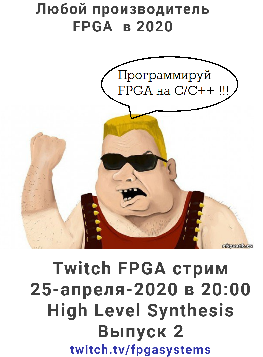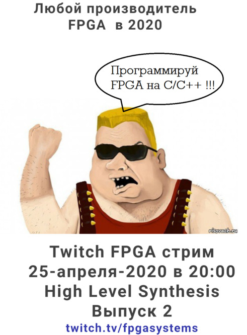 И снова здравствуйте. Стримы по ПЛИС набирают обороты. 25-апреля-2020 в 20:00 на канале twitch.tv/fpgasystems мы продолжим изучать высокоуровневый синтез. Если ты программируешь на С/С++ и ни чего не понимаешь в FPGA - тогда тебе к нам на стрим.