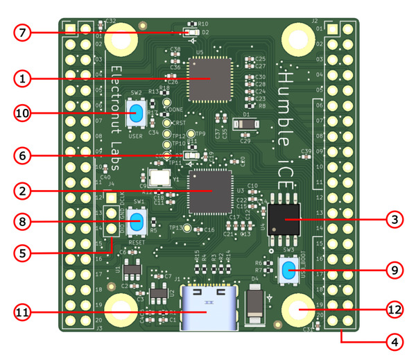 Electronut Labs представили новую отладочную плату Humble iCE, которая включает в себя Lattice iCE40UP5k и Raspberry Pi RP2040.