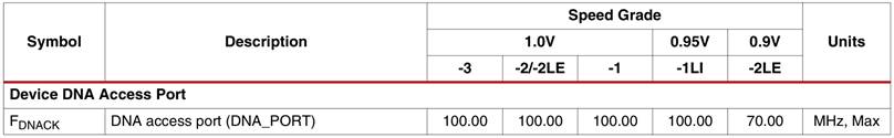 Одним достаточно важным ограничением является тактовая частота работы модуля DNA_PORT. Для того чтобы найти диапазон допустимых значений тактовой частоты работы модуля, необходимо обратиться к [3]. Согласно таблице на рисунке 4, максимальная рабочая частота чтения DNA для нашего кристалла на Arty Board составляет 100 МГц. Учтите эти ограничения, если вы будете использовать DNA_PORT: для других семейств значения могут отличаться.