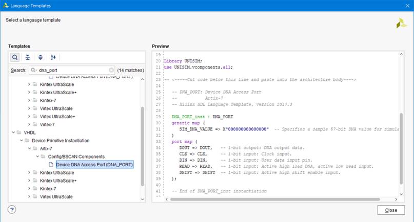 В этой статье рассмотрен аппаратный блок DNA_PORT ПЛИС Xilinx, который хранит уникальный номер FPGA, способный помочь Вам защитить Ваши проекты от копирования и вести учёт версий и отдельных копий прошивки. Использованный демонстрационный проект собран с помощью IP Integrator, который, начиная с версии Vivado 2017.1, поддерживает схемотехническое соединение модулей, написанных на SystemVerilog, Verilog и VHDL. Приведены полное описание модуля DNA_PORT, пошаговая инструкция по сборке проекта, результаты его поведенческого моделирования и аппаратной проверки, выполненной с помощью Logic Analyzer.