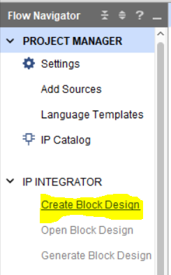 FlowNavigator →IP INTEGRATOR→Create Block Design: